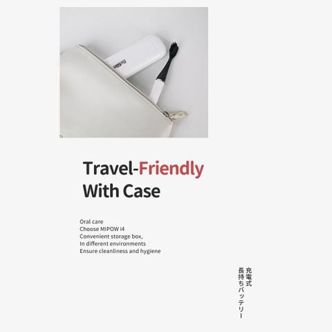 Hộp đựng cỡ nhỏ rất phù hợp cho du lịch: I4 đi kèm hộp đựng du lịch đóng/mở từ tính tinh xảo, nhẹ và nhỏ hơn 4 lần so với hộp đựng bàn chải đánh răng điện tiêu chuẩn. Điều này làm cho i4 trở thành người bạn đồng hành lý tưởng khi đi du lịch, đảm bảo bàn chải đánh răng của bạn luôn được bảo vệ khi di chuyển.