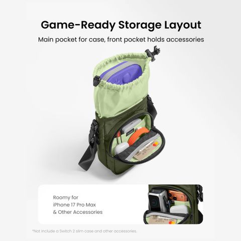 Túi Đeo Chéo Phụ Kiện & GameOn-G50 Switch 2 JoyCarry Sling Green G50S1T1được thiết kế "đo ni đóng giày" cho mẫu Nintendo Switch 2 Slim Case. Đây là sản phẩm đầu tiên trên thị trường cho phép người dùng cất gọn cả máy chơi game kèm theo lớp vỏ bảo vệ (case) của nó vào bên trong túi đeo
