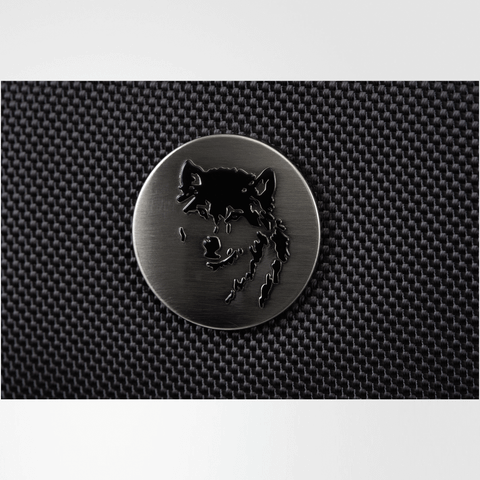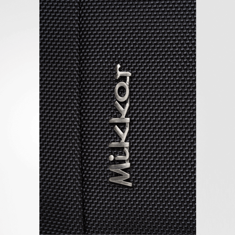 Mặt trước balo đính logo chú sói biểu tượng thương hiệu và logo hợp kim MIKKOR nổi bật.