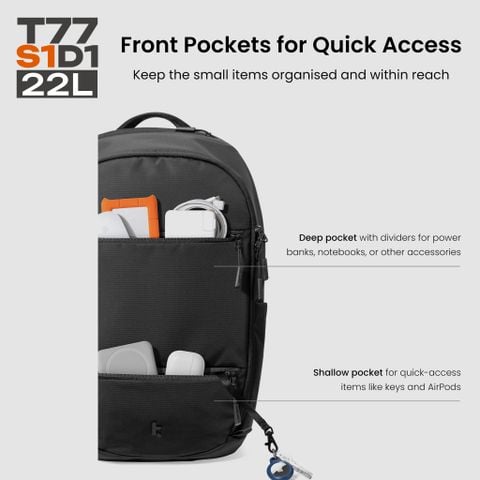 Ngăn chứa rộng rãi và có tổ chức: Thiết kế mở kiểu vỏ sò (clamshell) 22L cho phép chất đồ từ phía trước và truy cập từ phía sau dễ dàng. Nhiều túi bên trong và ngăn phụ kiện phía trước giúp sắp xếp gọn gàng các vật dụng nhỏ hơn.